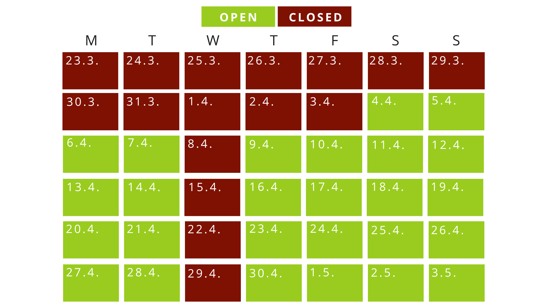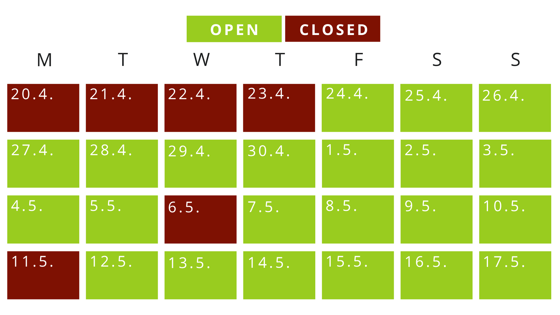 However, please also refer to our opening hours on Google Maps, which we update daily. Additionally, all available days can be seen in our online shop.